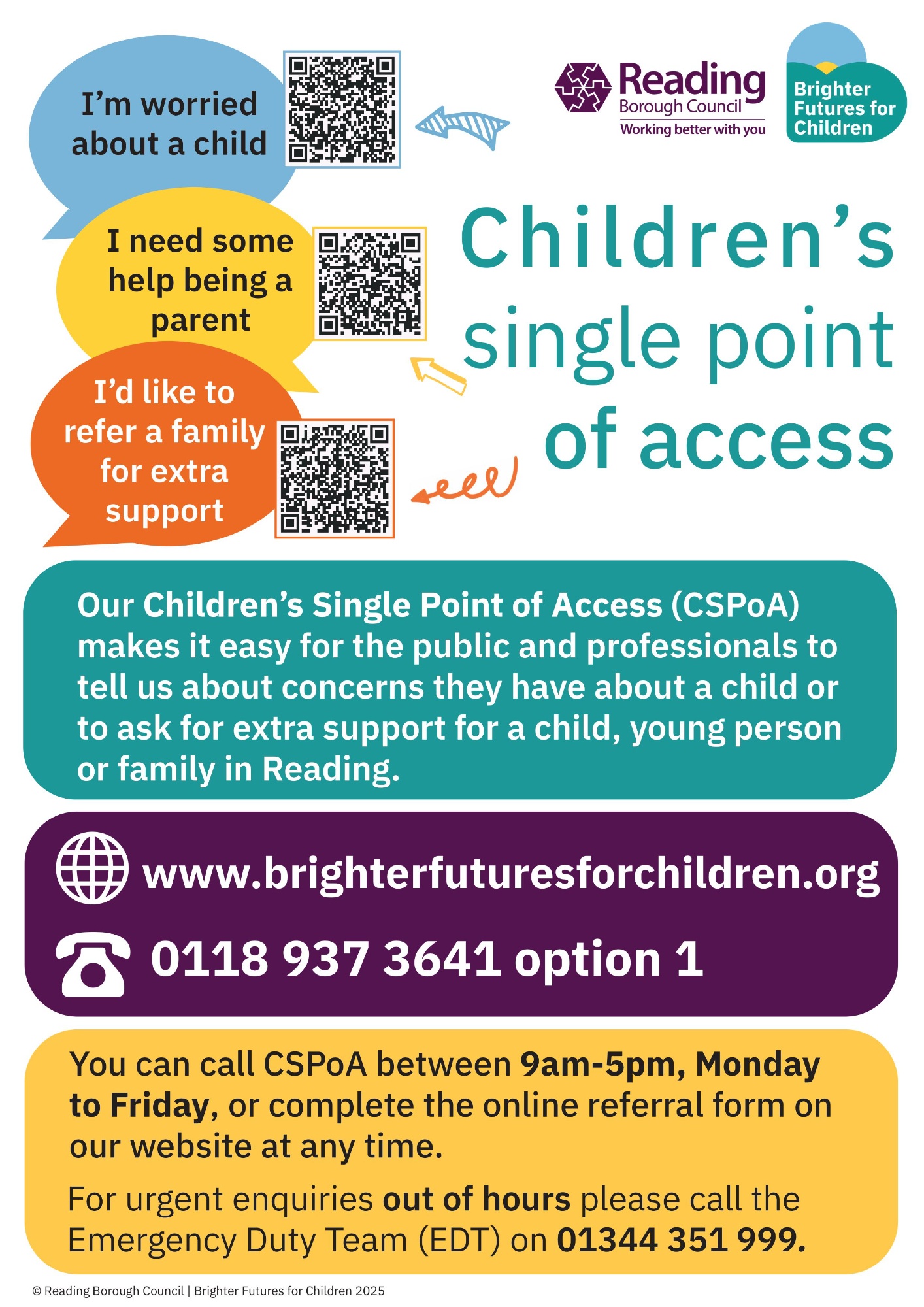 - Parents or staff with a concern can discuss with a designated officer or call the Children’s Single Point of Access on 01189 373641, or in an emergency, call 999