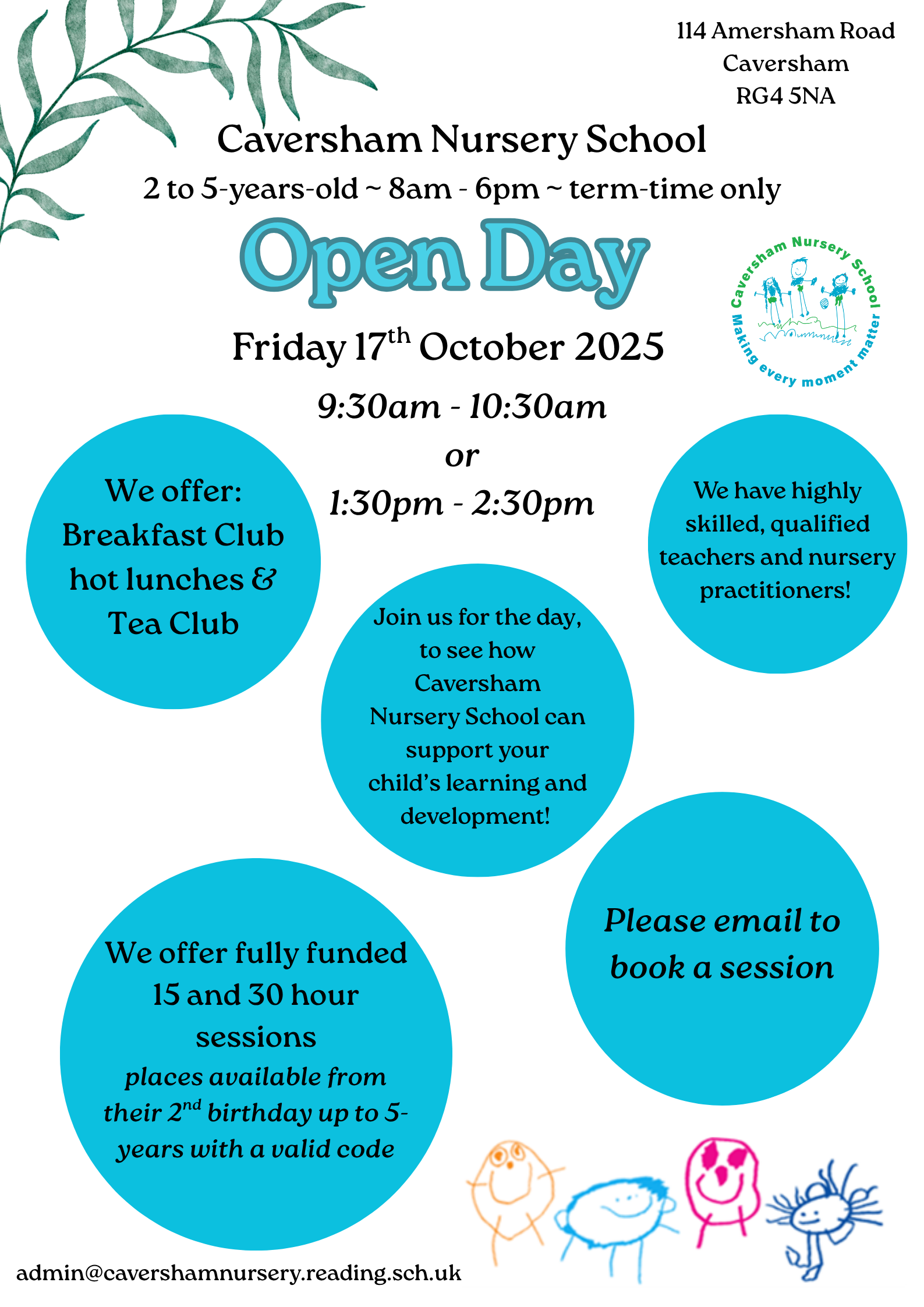 Please call 01189 375429 or email admin@cavershamnursery.reading.sch.uk to book.